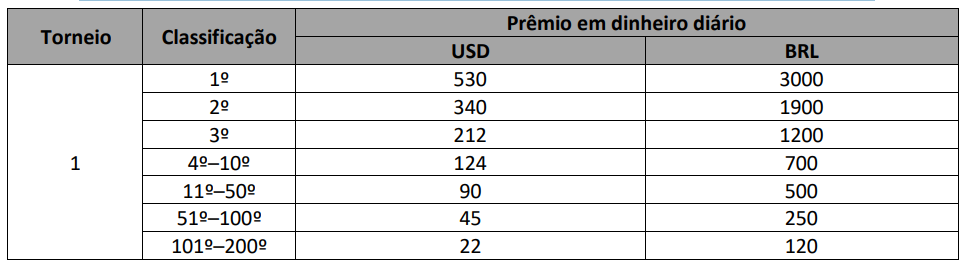 Um total de prêmios DIÁRIOS em dinheiro no valor de 10,000 USD/ 55,500 BRL para este torneio.